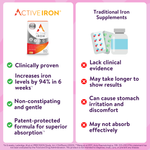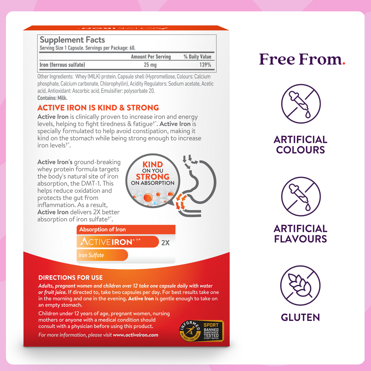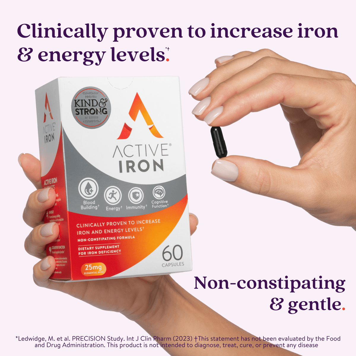 Active Iron is a clinically proven iron supplement. Active Iron’s advanced protein formulation is clinically proven to give better absorption of iron sulfate and is gentle enough to take on an empty stomach. Unlike other iron supplements that can cause constipation, nausea, and other digestive problems, Active Iron uses a unique whey protein technology that allows the iron to be carried safely through the stomach to the small intestine, where it is absorbed more efficiently. As a result, Active Iron is non-constipating and gentle on the stomach.