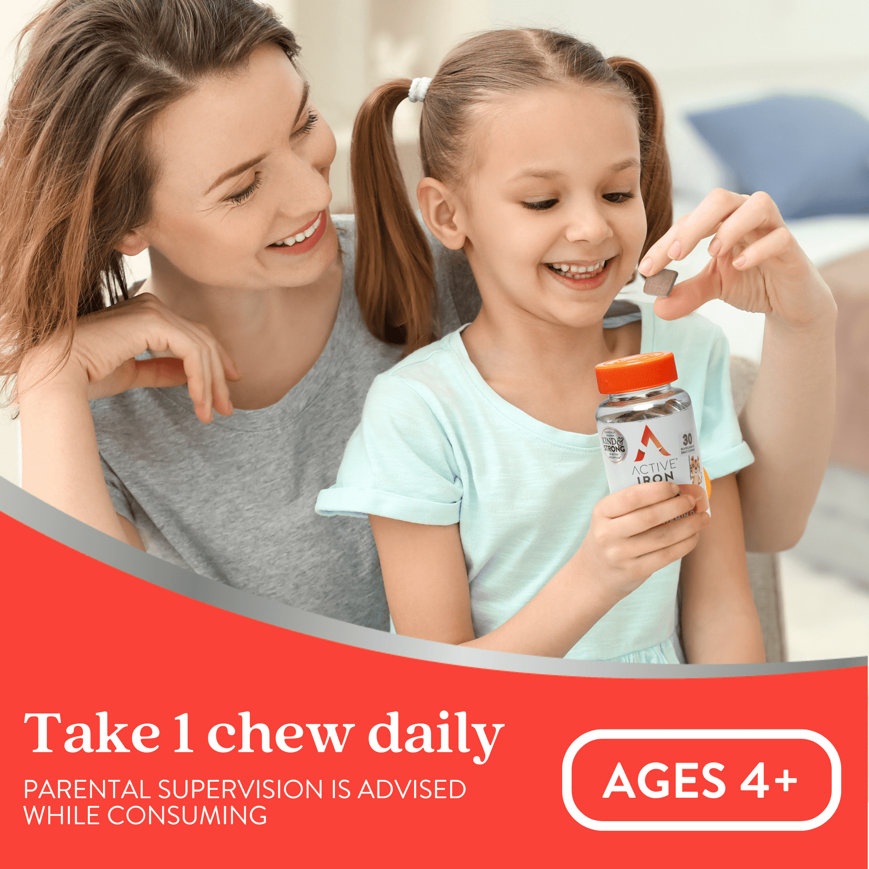 Children over four years take one Active Iron Kids chew daily. Active Iron is gentle enough to take on an empty stomach