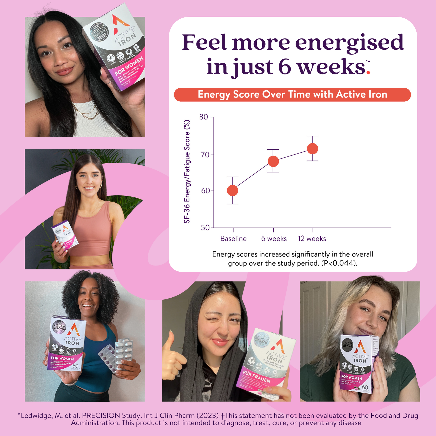 Monthly periods are the most common cause of iron loss among women worldwide. Research shows that women of childbearing age need 2X more daily iron than men. According to the Active Iron survey, 74% of women with heavy periods suffer from menstrual fatigue, with 87% admitting this negatively impacts their quality of life.